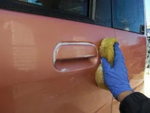 運転席側ドアノブまわりのキズの画像です。これをポリッシャーで研磨します。