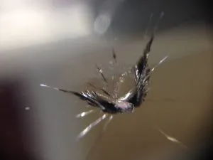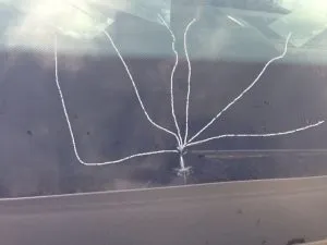 助手席側のピラーから10cmの位置で衝撃痕からいくつものヒビがあり、ディーラーでは「端の部分は割れやすいので交換です。」となってしまいます。
