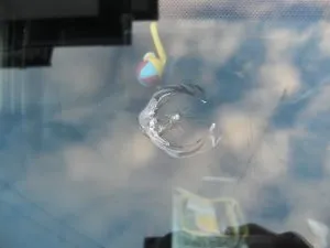 ガラス中央上側に3cmを超えるスターブレイクとブルズアイの複合型のヒビ。丸いヒビは剥離状態で今にもポロっと剥がれそうな危険なヒビです。施工も超慎重にやりました。