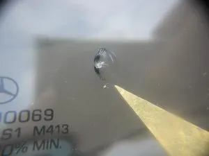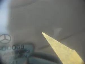 左下の角に近い部分にブルズアイと呼ばれている丸いヒビです。 この丸い形状はヒビと言うよりガラスの剥がれた状態と表現した方がわかり易いと思います。ガラスが浮いてる状態なので割れた隙間に不純物が入り易いため、早めの修理をお勧めします。
